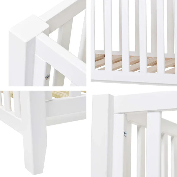 When the crib is converted into a bench, the seating area is 38.5cm above the floor, while the small shelf (bedside) is placed 19.3cm above the floor.