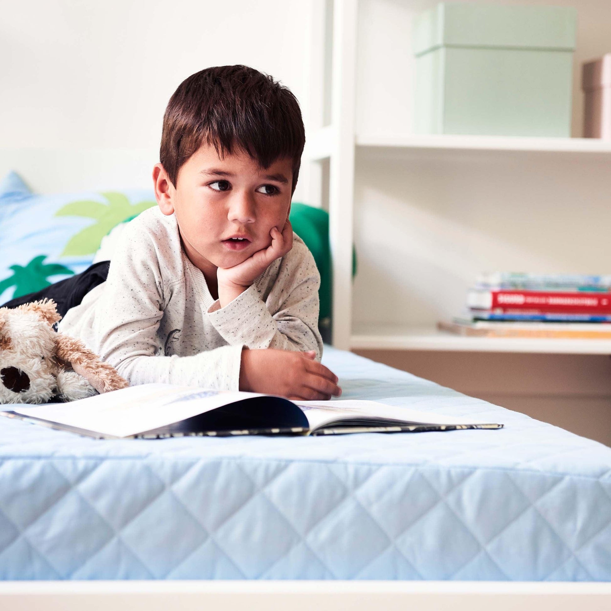 The Hoppekids Daybed in size 70x160 cm can be used either as an extra sleeping space or, with some added cushions and soft items, as a sofa and reading corner during the day. There is ample space for storage underneath the bed—for example, using the large, spacious drawers on wheels from Hoppekids.